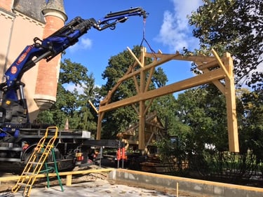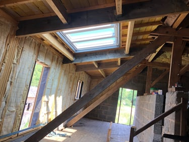 Conception et pose de charpente traditionnelle (bois massif) : réalisation sur mesure pour une structure solide et esthétique, idéale pour les maisons à l’ancienne ou les constructions authentiques.