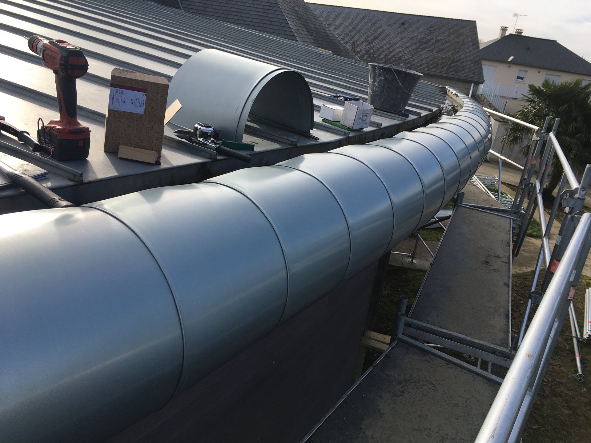 Toiture en zinc : arrondie, épousant parfaitement la forme de la charpente.